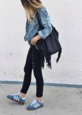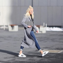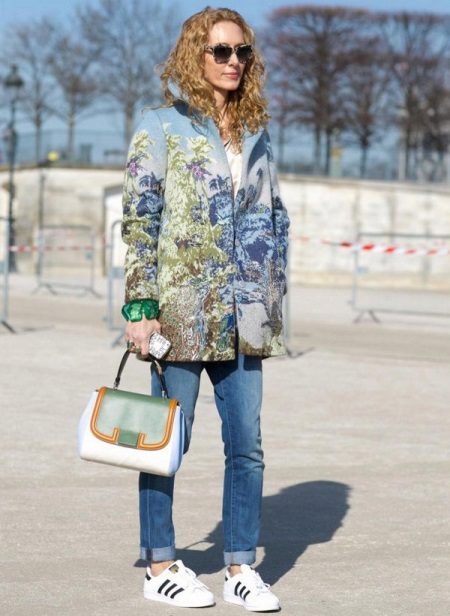 Striped sneakers can replace shoes, shoes, and any other shoes that you are used to wearing in everyday life. An example of this is the following image, in which jeans and rolled jeans, an original cropped coat and a stylish handbag are combined. And who dares to say that the sneakers are extra?