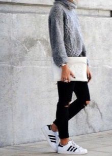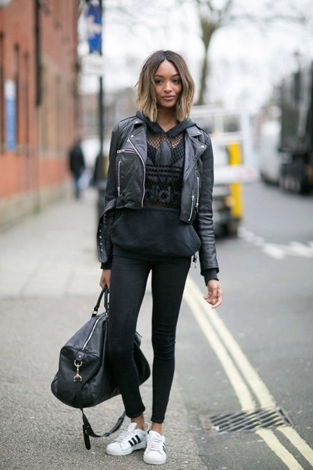 An image that suits every day can consist of tight jeans, an original sweatshirt, a biker-style jacket and stripes sneaker. In this way, you can go for training, on a trip, for a walk. A win-win option worth taking note of.