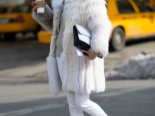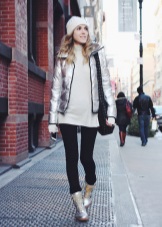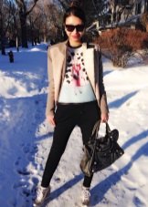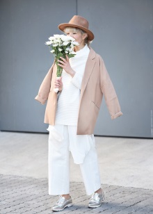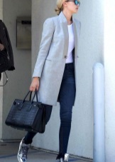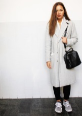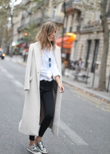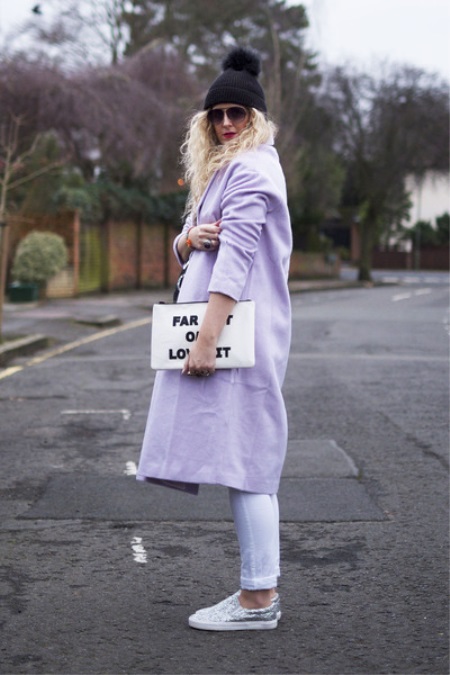 - Silver sneakers will make an excellent pair of pastel lilac coats. Wear them with light jeans, complementing the look with a white clutch and a black volumetric hat with a fur pompom.