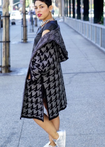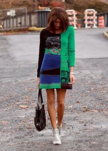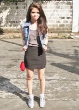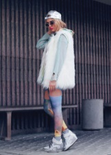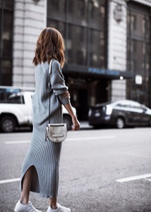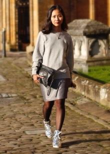 A voluminous knit dress will look great with silver sneakers. Especially if you choose knitwear in gray, white or mottled color. In addition, a dress can be replaced with a suit from a pencil skirt and crop top, which are incredibly relevant today. Such a game in contrasts will not leave anyone indifferent, the combination of textured wool and smooth shiny skin looks very impressive! No less attractive are the whips from other materials.