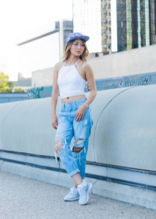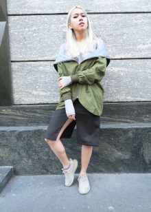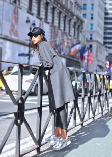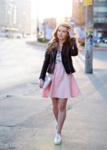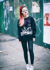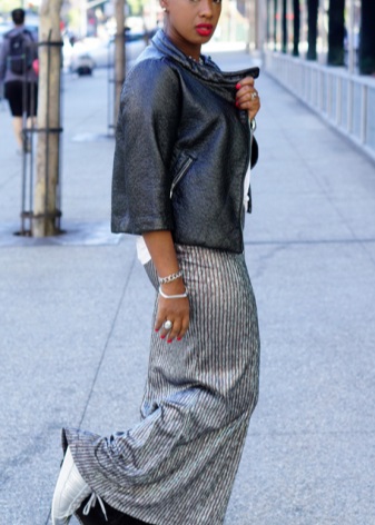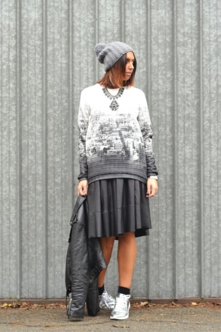 - Stylish urban look. A leather midi skirt of the Sun style, a black and white sweatshirt, a jacket, a gray cap and silver sneakers with black socks. The image is complemented by a spectacular massive necklace.