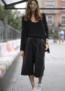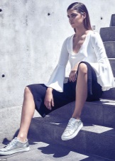 The best way to show off shiny shoes is to wear them with cropped trousers. Culottes make the perfect pair of silver sneakers. Despite the fact that the skirt is a representative of the business style, in practice they look great with semi-sports shoes.