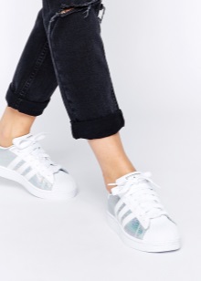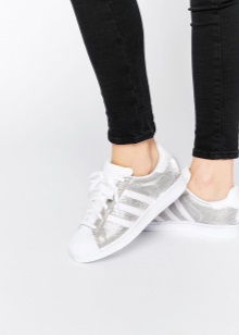 The legendary Adidas Superstar sneakers are presented in various variations. There are quite restrained white models with silver or holographic stripes. There are sneakers made entirely of silver leather, both matte and glossy. Textile models with gliterre are popular, which attract attention with a scattering of iridescent particles.