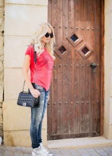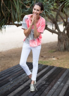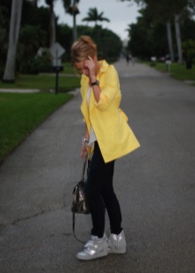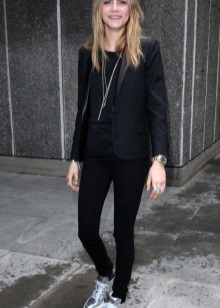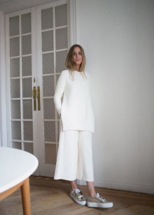 If you want to combine a trouser suit with sports shoes, choose a model of a slightly loose cut that will look more like a man's. You can also stay on a suit in pajama style made of silk or glossy cotton.
