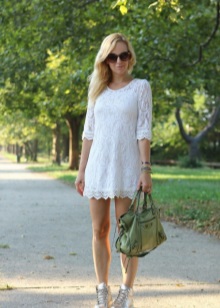 - On a date, you can wear a blue lace midi-length dress, complementing the look with silver sneakers and a matching bag. Stop your look on a small clutch envelope or a bulk bag that can be decorated with a silk scarf. Surprise your chosen one with a gentle, but at the same time unusual bow.