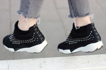- Not the last condition is the color of the shoes.The best option is black or white models. Bright sneakers decorated with rhinestones, this is overkill. They are relevant only for a specific image.