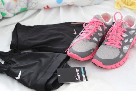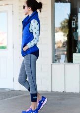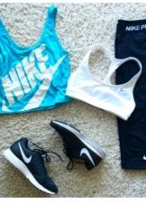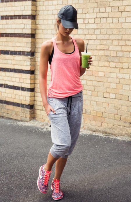 Colorful running shoes in combination with cropped sweatpants and a double tank top will appeal to any modern girl