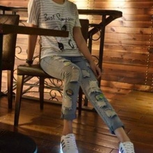 A win-win combination - sports shoes and jeans. A youth jumpsuit with cropped trousers and torn fragments looks harmonious with white sneakers that match the tone of a loose t-shirt. The luminous sole makes the ensemble interesting and playful. A small brown handbag over the shoulder matches the frame of the girl’s glasses in color.
