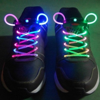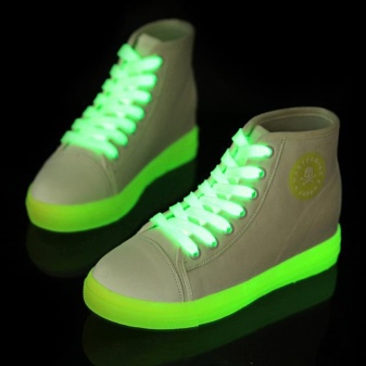 As for the luminous laces, they are made of special light-conducting material, similar to flexible plastic, which stretches a little, but does not deform. Such laces are easy to bend and tie in a knot. They shine due to LEDs that form directional rays. For a uniform glow, proper lacing is required (without kinks and excessive tightening).