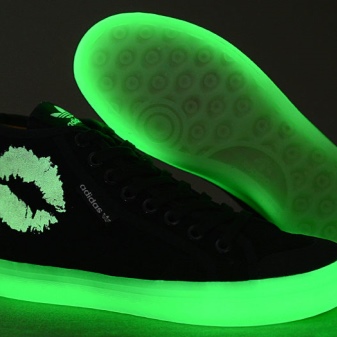 As for adult options, the most popular sports products with backlit soles. However, there are other luminous elements: laces, emblems, various inserts. There are more expensive sneakers that glow in the dark entirely.
