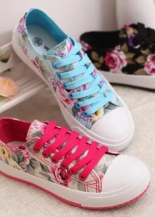 It is fashionable now to wear textile sneakers with bright prints - floral, animal, geometric, polka dots, stripes - whatever your heart desires, for any choice.