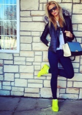 - The neon sneakers of the brightest colors are perfectly combined with white trousers (without arrows). Also, narrow trousers with a white shirt will look stylish with such sneakers.