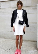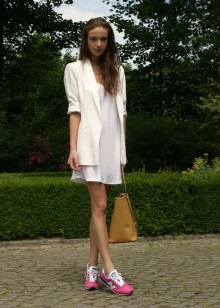The combination of sneakers with a dress is not so long ago in fashion. However, such a feminine image can be applied to bright sneakers. It is worth repeating that here once again everything is harmoniously combined.