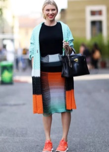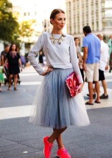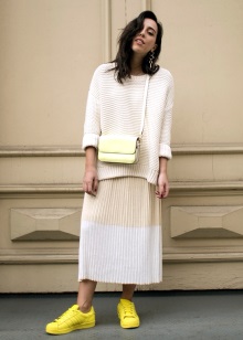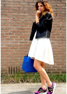 - Girls can also combine vibrant sneakers with a mid-length knee-length pencil skirt. For top clothes in this style, a top, shirt, pullover, short jacket are suitable. In this case, no more than three colors are allowed in clothes. But when creating a bow with bright sneakers, it is important to remember the table of contrasts so that the image looks harmonious.