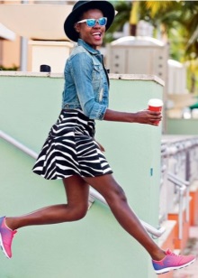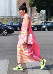 Dresses with bright sneakers can be worn in different lengths. At the same time, dresses are not only allowed, but also a variety of color prints are welcome.