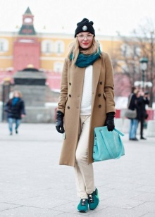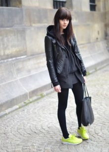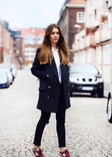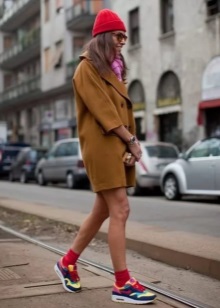 - Bright colored sneakers can be worn with a coat, with a vest and even with a fur coat. The image with the coat is especially interesting, practical and beautiful. A knee-length volume coat will look great with vibrant sneakers.