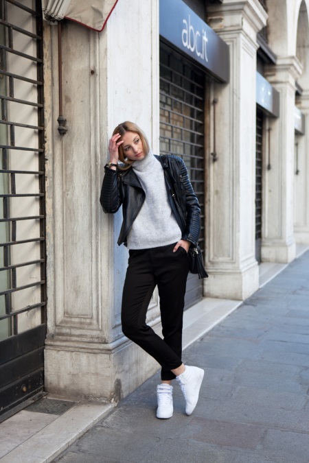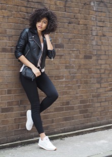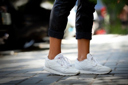 In addition to jeans, Reebok white sneakers will pair wonderfully with classic black leather leggings.