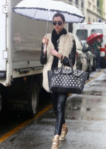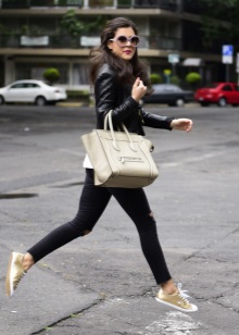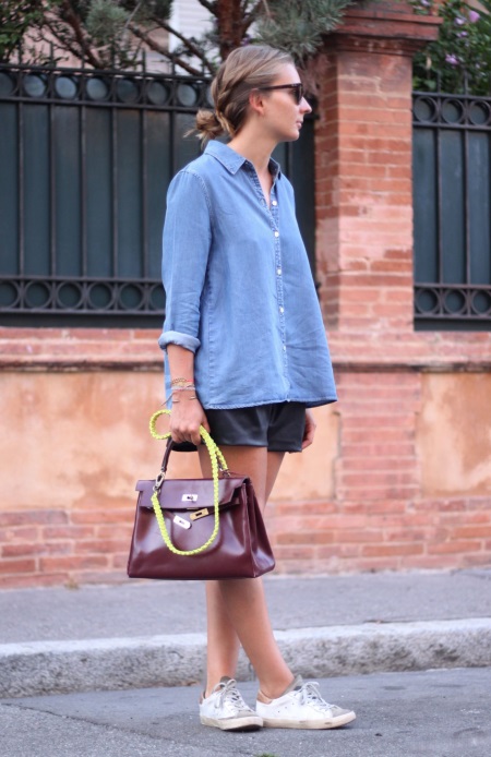 - Bags and clutches of a metallic shade will interrupt the brightness of sneakers.
