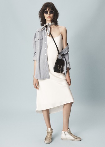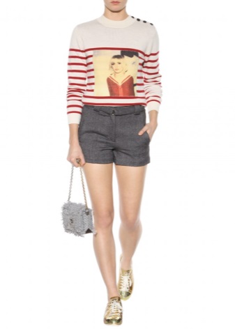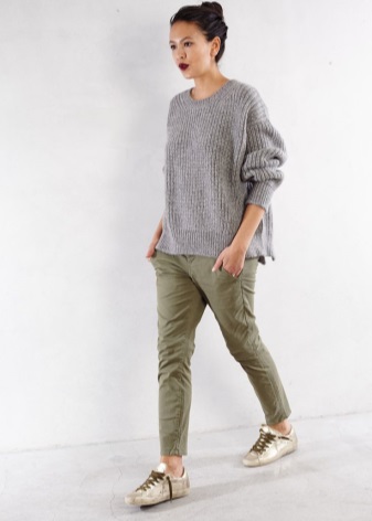 Solid-colored clothing categorically does not suit golden sneakers. The function of these shoes is to give the appearance cheerfulness, and gray shades will turn sneakers into an ordinary dull thing.