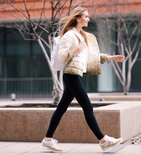 Choosing the right color with gold sneakers is a rather time-consuming affair. In order not to spoil the image, opt for delicate, pastel shades, or clothing without too bright patterns.