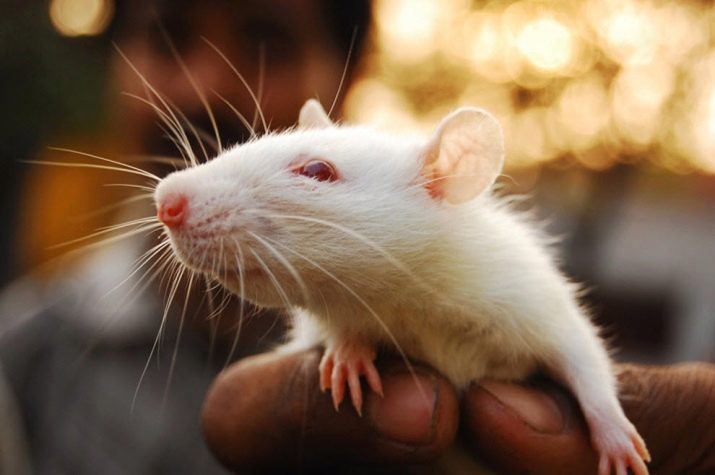 This animal has no special differences from the traditional gray rat, except for the special color of the fur coat and eyes. These features of appearance were the result of insufficient amounts of melanin in the blood. In fact, the animal’s eye protein is transparent, and veins of blood vessels that pierce the eye are colored red.