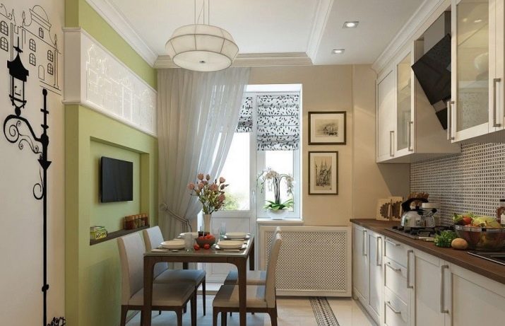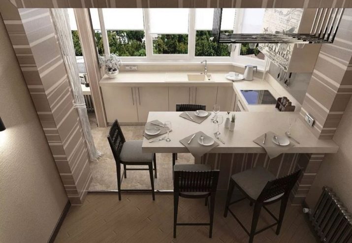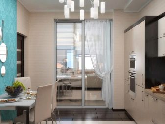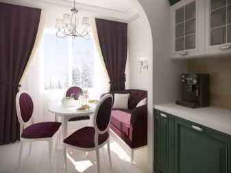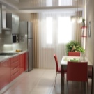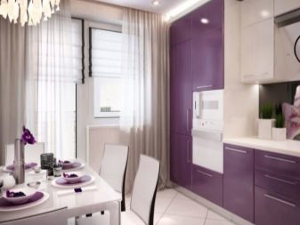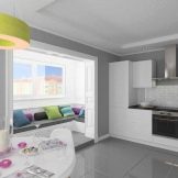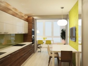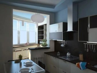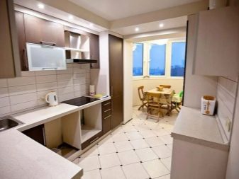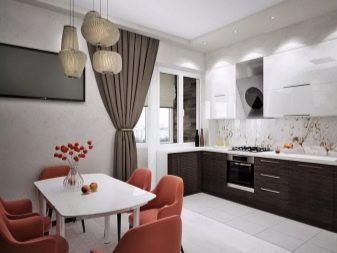 The main task that needs to be solved in this case is to increase the comfort and at the same time the visual elegance of the room. You can use the balcony as a continuation of the main space in two versions - with a clear separation from the kitchen itself or with their complete merger. If the separation wall is removed, the total usable area grows markedly. To create coziness, they use original color schemes. Furniture is usually made to order, trying to maximize the use of space.