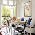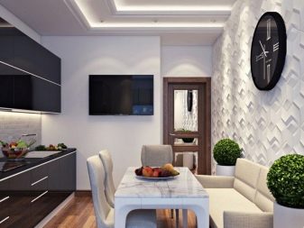 The principle of reasonable moderation must be adhered to.. If the finishing materials are bright and juicy, they should moderate the type of furniture (and vice versa). When thinking over the organization of the dining area, it is necessary to pay attention primarily to personal needs. So, a family of 3-4 people urgently needs a spacious table. Single people and couples can choose more modest furniture, unless they often invite guests.