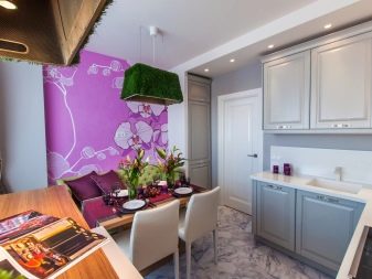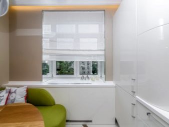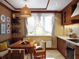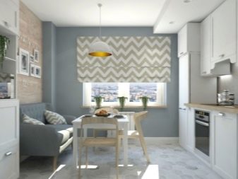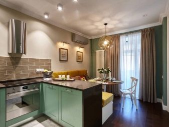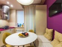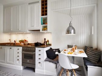 - An interesting arrangement of a square kitchen. The sofa is very nice, and will serve as a berth. Correctly selected colors do not “squeeze” the space.