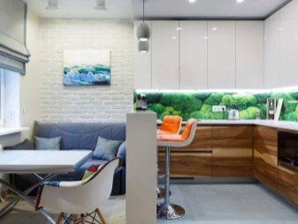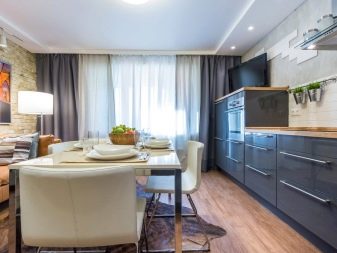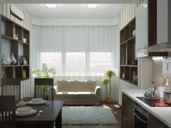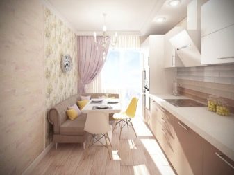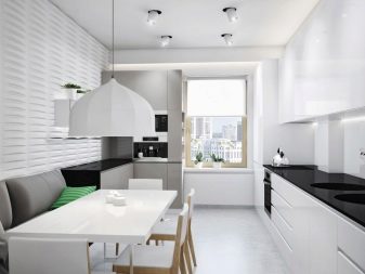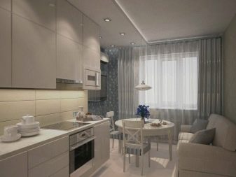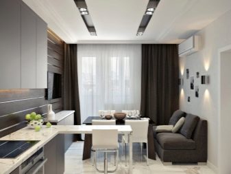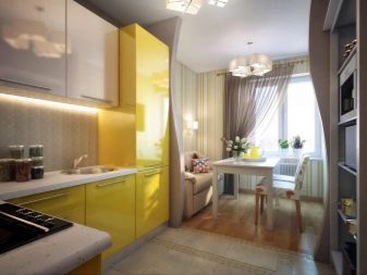 You can do a parallel arrangement: place the entire headset along one wall, and put the sofa at the opposite. The table in this case stands either near the sofa or at the window (if the kitchen does not have a balcony). With a balcony, the layout changes a little, but you can turn the windowsill into a bar, which many also like.