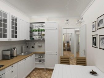 - rectangular kitchens are furnished with an eye to the fact that the arrangement does not make the room visually narrower, therefore they often resort to a corner layout;