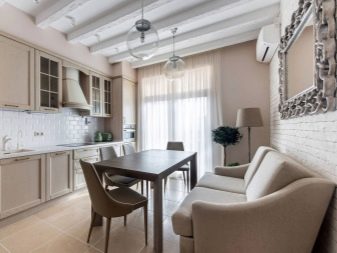 - Clear zoning, calm colors, the living area and the dining area fit in one area. The sofa, which is laid out, when folded, looks like a convincing element of the kitchen.