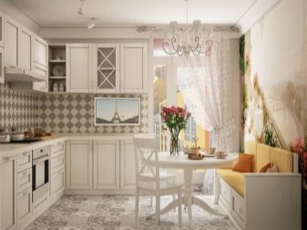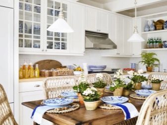 - Provencal style. Give preference to gentle pastel shades and natural colors. It’s great if you can find retro-style headsets and thin, exceptionally decorative beams appear on the ceiling. Decorate the space with objects that are associated with a rural vacation: wicker baskets, rowed jars of jam, beautiful containers for spices that are not hidden in lockers, but are in plain sight. Light curtains gently sway on the windows, on the wallpaper you can see cute wildflowers (small), the tablecloth can be openwork or linen.