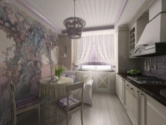 - The kitchen is narrow, but light colors in the decoration soften this perception. The owners chose the ottoman, which is in no way inferior to the sofa. You can call the idea with photo murals and perspective on them a great idea - a good technique for the visual expansion of space.