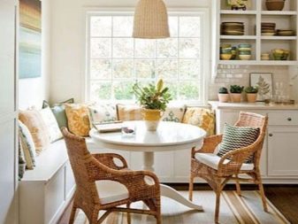 - This is not a very standard sofa, but such a solution can be interesting. The kitchen turns out very summer due to bright color accents and a wicker chair.