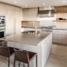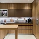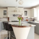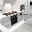 - C-shaped kitchen It resembles the U-shaped described above, but in this case one of the wings is shortened and bent toward the center of the room, forming the so-called peninsula. This bend is usually either a continuation of the countertop, or a bar counter adjacent to the headset, but giving access from three sides. If you do not have a clear idea of why you need the peninsula, then in a 12-meter kitchen it is better to refuse it - it has too many drawbacks, among which is blocking the space, especially in narrow rooms.