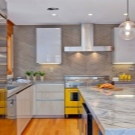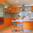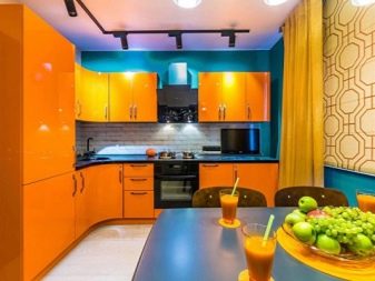 Yellow or orange design - This is an emphasis on the fact that in the kitchen you should always feel cheerfulness and fun. In humans, these colors are associated with sunlight, delicious southern fruits and beautiful flowers, because in their environment the tone inevitably increases. So that the interior is not dazzled in the eyes, it can be “cooled” with the help of black and white colors and interspersed with the other colors listed here.