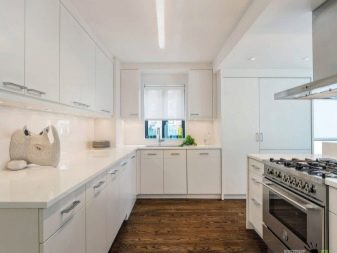 - Double row option a headset is appropriate in a rectangular or even square kitchen, when it is advisable to equip cabinets and appliances along two opposite walls.Experts say that the passage should never be 1.2 meters (fire safety requires this), but for adequate placement of the dining area, its width should be even greater - from 2 meters. If you do not have so many free squares, you will have to arrange a snack area on the bar counter.