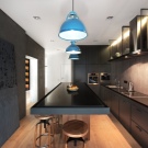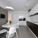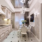 Since the kitchen is rather narrow, the classic four-burner panel is replaced by an elongated two-burner, and an unusual shape sink is made to order. In the dining area there is a rather large oval-shaped table for more than 6 guests. Next to the table are modern chairs of the same shade. Near the dining area on the wall are several paintings in glazed frames.