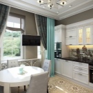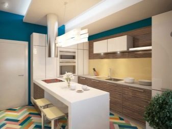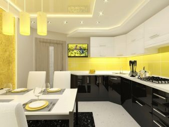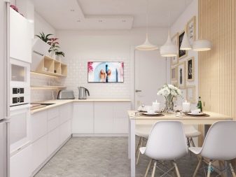 For walls, special washable wallpapers covered with a protective film, washable paint, as well as decorative plaster are suitable. The apron is traditionally decorated with ceramic tiles. The ceiling in the 13-meter kitchen would be nice to stretch. Quite often, ordinary paint is also used, but it still disappears from exposure to moisture over time.
