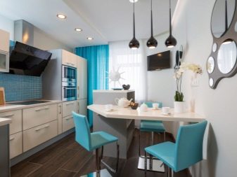 The kitchen, decorated in the Scandinavian style, looks very cool. A very stylish corner set is located in such a way that the number of wall cabinets is less than floor. The result is a pair of floor lockers, which are used as a food intake or cooking process. Access to the contents of the boxes is carried out on both sides. Decorated kitchen in beautiful beige and blue-gray hues. The border between the cooking zone and the dining area is “drawn” using two stools of an unusual shape in white and black.
