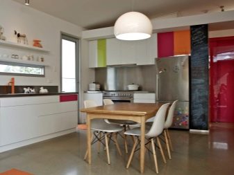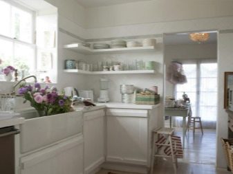 It is better to choose modern furniture, and curtains should either be absent or be quite strict. As lighting, modern design lamps or old "industrial" lamps are suitable. The style of shabby chic will make space romantic, and as a decor to use a lot of retro details. In such a kitchen, even outdated furniture or appliances will look appropriate and stylish.