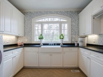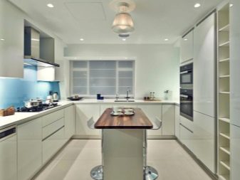 U-shaped headset for a room with an area of 13 square meters. m is chosen moderately compact, with a small length. In order not to overload the space, it is advised to abandon the wall cabinets and replace them with open shelves. It makes sense to place the sink right by the window, eliminating the window sill and placing part of the headset in its place. Separately, it is necessary to mention the layout using the island. This part of the interior is used either as a work area, or as a place for dinners or quick snacks.