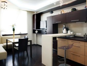 As for the quantity and type of furniture used, such parameters are determined depending on the functionality of the room. For example, if the owners don’t like to cook and spend time at the table, then you can restrict yourself to a bar counter, but if you often gather guests, you should not forget about the transformer table. The kitchen-bedroom will require a sofa bed and a small table nearby. As for lighting, experts recommend choosing a large chandelier as the main source of light, as well as highlighting each important area with spotlights, sconces or floor lamps.