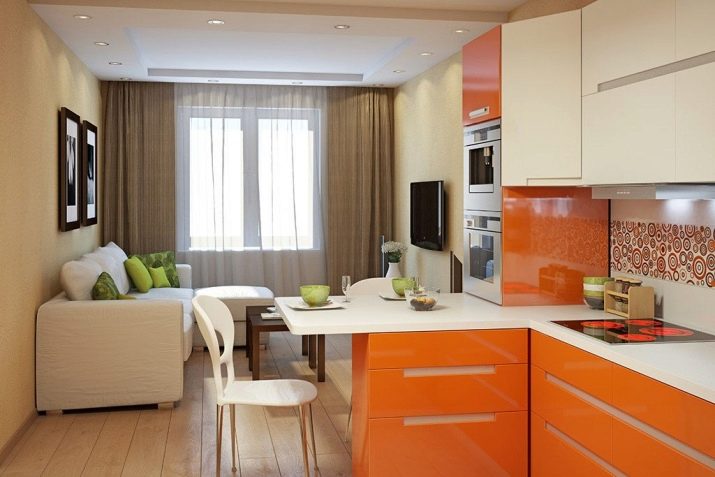 The “separator” between the two zones is a small bar counter, to which a pair of high chairs are attached. It is important to mention that the color of the kitchen set is rich bright orange, but the living room is decorated in soothing beige shades, which balances the overall picture.