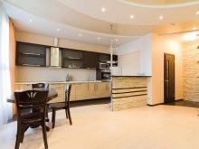 - Ceiling. The ideal solution is a stretch web. It can be glossy, matte, semi-gloss. A great solution is a multi-level ceiling. You can safely decorate the ceiling with drywall, or simply align and paint. In a large kitchen, the ceiling can be decorated with stucco or beamed, depending on the chosen style.