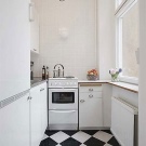 A good way to save space will be vertical planning and the rejection of large-sized household appliances. For example, a full-fledged oven can be replaced with a microwave oven, mounted in the headset with a mini-fridge up to 90 cm high, a 4-burner hob can be replaced with a two-burner analog. A mini-sink and a general reduction in the size of the headset to 40 cm in depth will also make the kitchen more spacious. Whenever possible, all built-in appliances are located in a column - in one corner, from floor to ceiling. An extract hood is also better to choose one so that it can be placed behind the front of the cabinet.