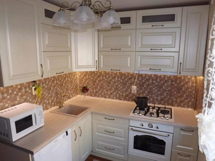 When repairing a kitchen of 7 square meters. m apron is usually trimmed in the same tone as the rest of the kitchen.