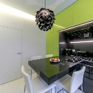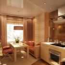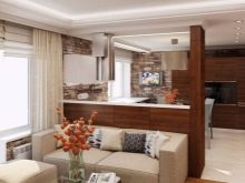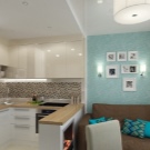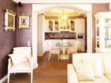 The classic connection of space implies a lateral exit. The total area after connecting the kitchen and the guest area is usually 14-17 square meters. m. The division of space is most often produced by arches and screens. But can be used and expressive color separation, and demarcation with furniture. Of course, when merging rooms, you will have to ensure stylistic unity.