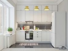One of the secrets of a successful design for a kitchen of 8 square meters is the choice of an L-shaped configuration. In any case, it will be more practical than the direct arrangement of furniture. It is necessary to remember the rational height of the furniture products themselves. They are positioned so that they do not have to get up on stools or bend strongly during everyday work.