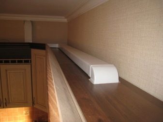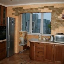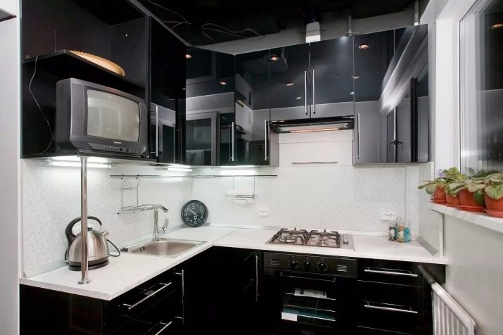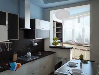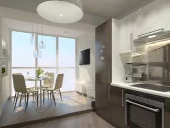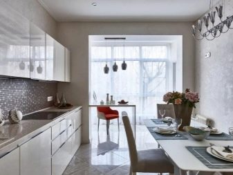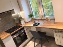 In this embodiment, the window sill usually becomes a logical continuation of the countertop. Some kitchen cabinets and other storage systems are transferred to the balcony. They also include rarely used equipment and some products.